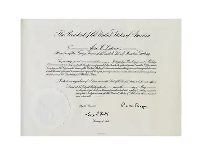 • Nguyên Viên chức lãnh sự Sở Ngoại Vụ thuộc Bộ Ngoại Giao Mỹ do chính Tổng Thống Reagan bổ nhiệm.