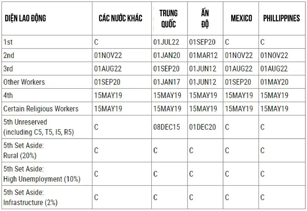 Ngày tiếp nhận hồ sơ dành cho chương trình EB-5 có visa ưu tiên dành riêng cho tất cả các nước, trong đó có Việt Nam, hiện đang nằm ở tình trạng là “Hiện tại –“C”.