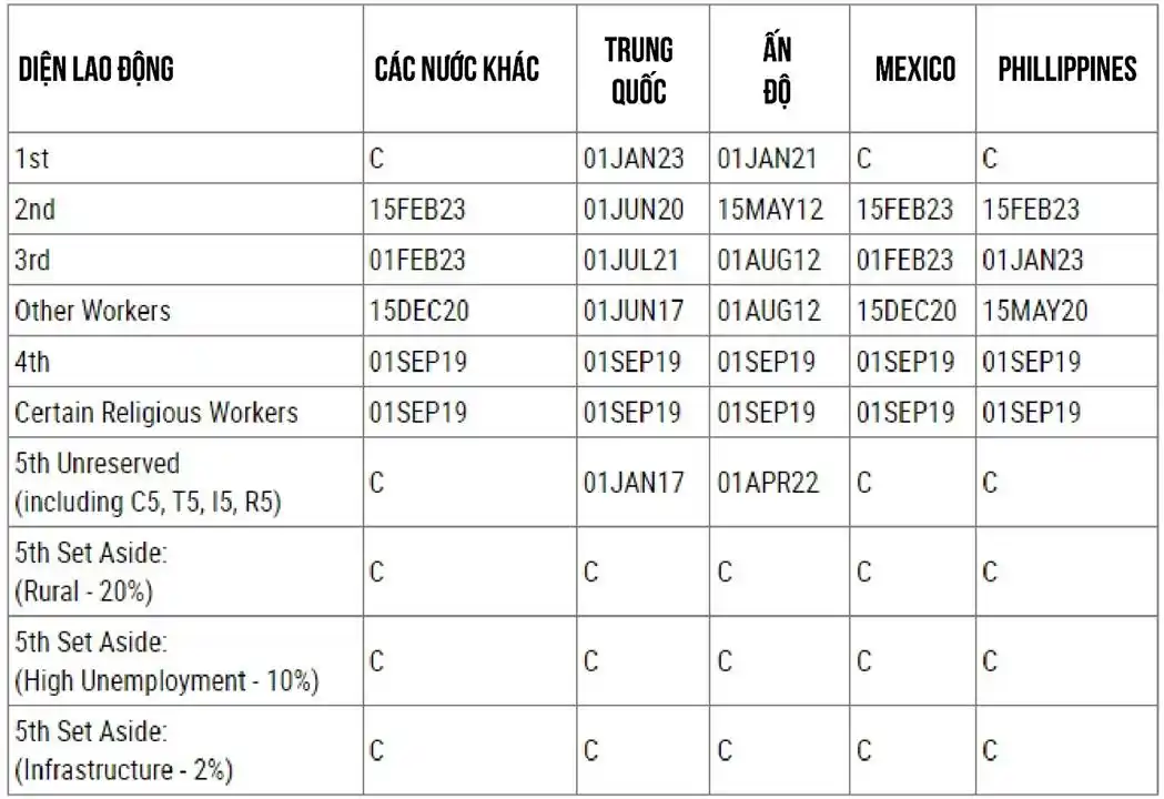 Ngày hành động cuối cùng dành cho chương trình EB-5 có visa ưu tiên dành riêng cho tất cả các nước, trong đó có Việt Nam, hiện đang nằm ở tình trạng là “Hiện tại –“C”.