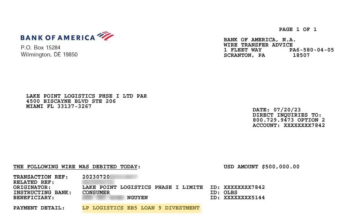 Giấy xác nhận ngân hàng hoàn vốn EB-5 từ AVS
