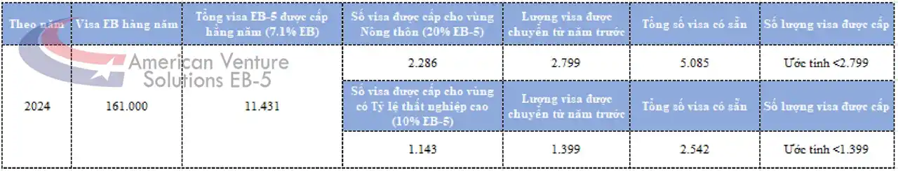 Trong năm tài chính 2024, USCIS đã thống kê dự kiến lượng visa EB-5 được phân bổ nhiều hơn từ năm 2023. Hạn mức cấp thị thực không còn ở mức 10.000 như trước mà đã tăng lên ở mức 11.461 thị thực, đồng nghĩa với việc các thị thực cần phải được ưu tiên xử lý trước các thị thực mới được cấp vào năm tiếp theo.
