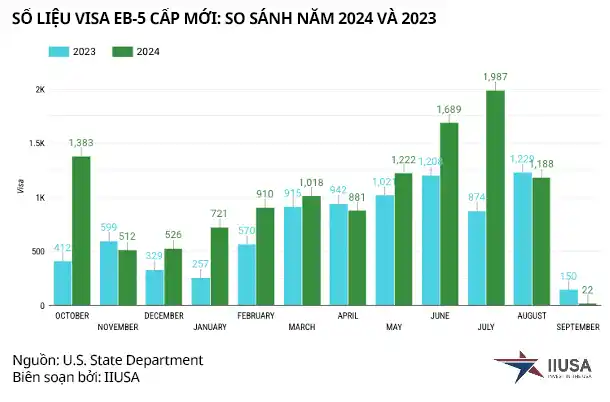 Việc cấp thị thực EB-5 đạt đỉnh trong giai đoạn từ tháng 05 đến tháng 08/2024 với 6,084 thị thực, chiếm đến hơn 50% lượng thị thực được cấp trong năm. Chỉ có 22 visa được cấp trong tháng 09/2024 do hạn ngạch thị thực đã cạn kiệt vào cuối năm tài chính.