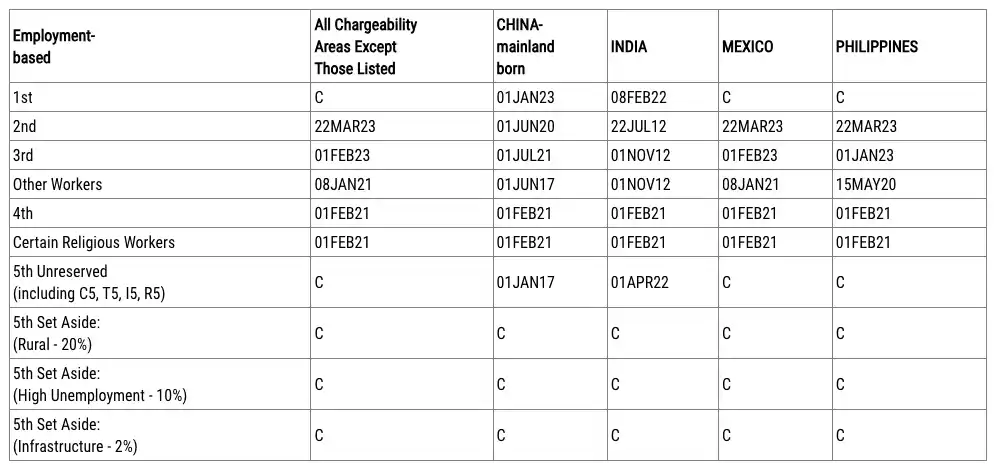 Trong hạng mục thị thực “dành riêng”, tất cả các quốc gia, bao gồm cả Việt Nam đều hiển thị trạng thái “Hiện hành – Current”. Còn trong hạng mục thị thực “không dành riêng”, vẫn không có sự thay đổi về ngày hành động cuối cùng cho đương đơn Trung Quốc và đương đơn Ấn Độ.