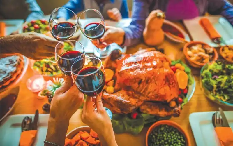 Những gia đình cùng nhau mừng rượu và thưởng thức gà tây nướng