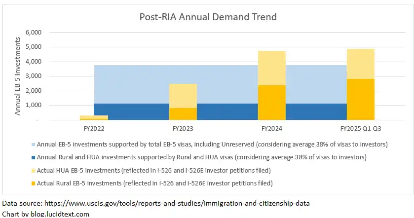 Các số liệu mới nhất được công bố (tính đến tháng 6/2025) cho thấy một thực tế đáng lo ngại đối với chương trình EB-5. Nhu cầu cho các danh mục visa "ưu tiên" (dành riêng) mới đã tăng vọt: