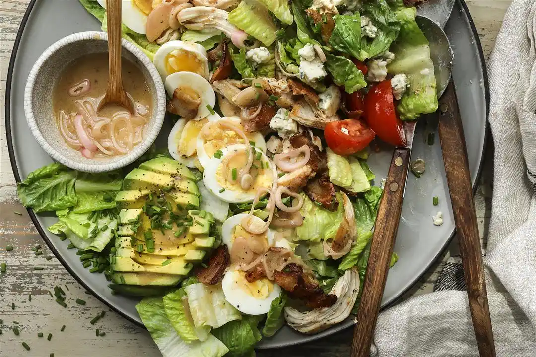 Để làm nên món Cobb Salad, bạn cần chuẩn bị một số nguyên liệu quan trọng như trứng luộc, thịt gà nướng hoặc thịt xông khói, bơ, cà chua, rau salad và phô mai xanh (blue cheese). Khi ăn món salad này, bạn cần phải cho thêm sốt vinaigrette để làm tăng hương vị.