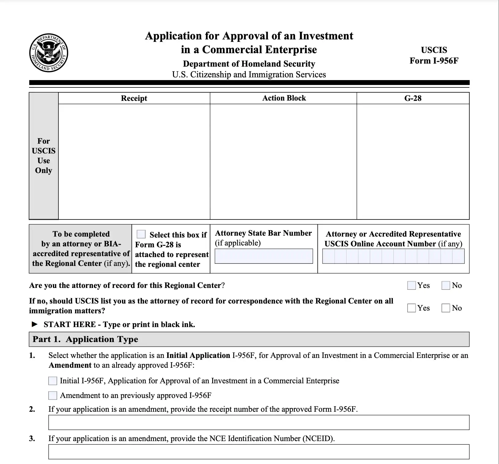 Trong đó, Đơn I-956F là Đơn xin Chấp thuận Đầu tư vào doanh nghiệp thương mại và Đơn I-956G gồm Báo cáo thường niên của Trung tâm vùng. Hai Mẫu đơn này được tạo ra theo quy chế sửa đổi về điều lệ EB5 thuộc khoản 203(b)(5) của Đạo luật Nhập cư và Quốc tịch (INA), và được yêu cầu nộp đối với một số trường hợp cụ thể thuộc Chương trình trung tâm vùng. Các đơn này sẽ phải được nộp kèm theo đơn xin thị thực nhập cư của nhà đầu tư nước ngoài.