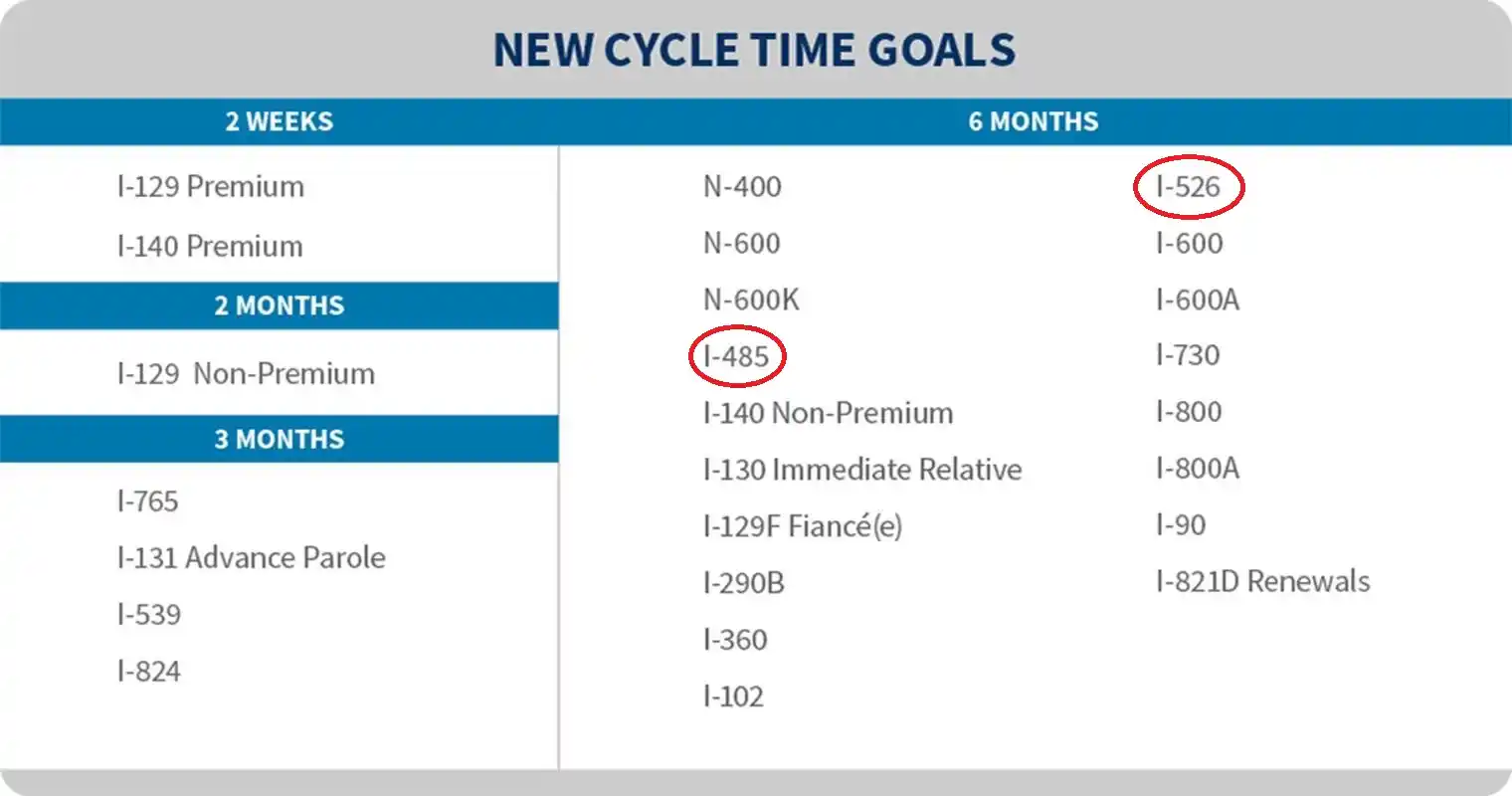 Hiện nay, thời gian chờ xử lý trung bình của đơn xin thẻ xanh điều kiện I-526 từ Việt Nam là từ 35 tháng (3 năm) cho đến 58.5 tháng (4.8 năm). Để giảm tải tình trạng tồn đọng trong quá trình đang chờ xử lý, USCIS đã đặt mục tiêu thời gian chu kỳ nội bộ mới ngay lập tức. Các mục tiêu này là thước đo nội bộ trong nỗ lực giảm thiểu tồn đọng của lực lượng nhân viên xử lý hồ sơ và quy định thời gian nhân sự phụ trách xử lý các trường hợp. Khi thời gian chu kỳ được cải thiện, thời gian xử lý hồ sơ sẽ hiệu quả hơn và đương đơn nhận thấy hồ sơ của mình sẽ được giải quyết một cách nhanh chóng, dứt khoát. Như vậy, dưới Đạo luật cải cách và liêm chính EB5 2022 vừa ban hành, USCIS đã có những hành động đầu tiên nhằm nâng cao năng lực, cải tiến công nghệ và củng cố nhân sự cho toàn hệ thống xét xử đơn nhập cư nói chung, và Chương trình EB5 nói riêng. Điều này có lợi cho cả các đơn xin thị thực định cư diện EB5 trung tâm vùng đã nộp trước 01/07/2021 và cả hồ sơ nộp mới từ 15/05/2022. USCIS đồng thời dự kiến sẽ đạt được các mục tiêu thời gian xử lý này vào cuối năm tài chính 2023.